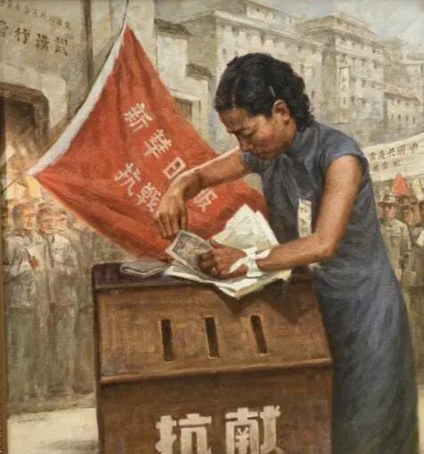 這幅著作表達的是1938年中國共產黨安排社會各界為武漢會戰捐款的畫面。「地不分南北,人不分老幼,皆有守土抗戰之責。」在這樣的號召下,1938年7月7日,全國公民緊密聯合,支持抗戰。武漢公民也與全國公民一同發動了轟轟烈烈、大張旗鼓的救亡獻金運動。武漢「七七獻金運動」在5日內籌資百萬,是抗戰期間規劃最大的獻金運動。這些看似微乎其微,但卻飽含著火熱愛國熱情的分分角角,最終匯成激流,變成了殺敵的槍炮子彈。
